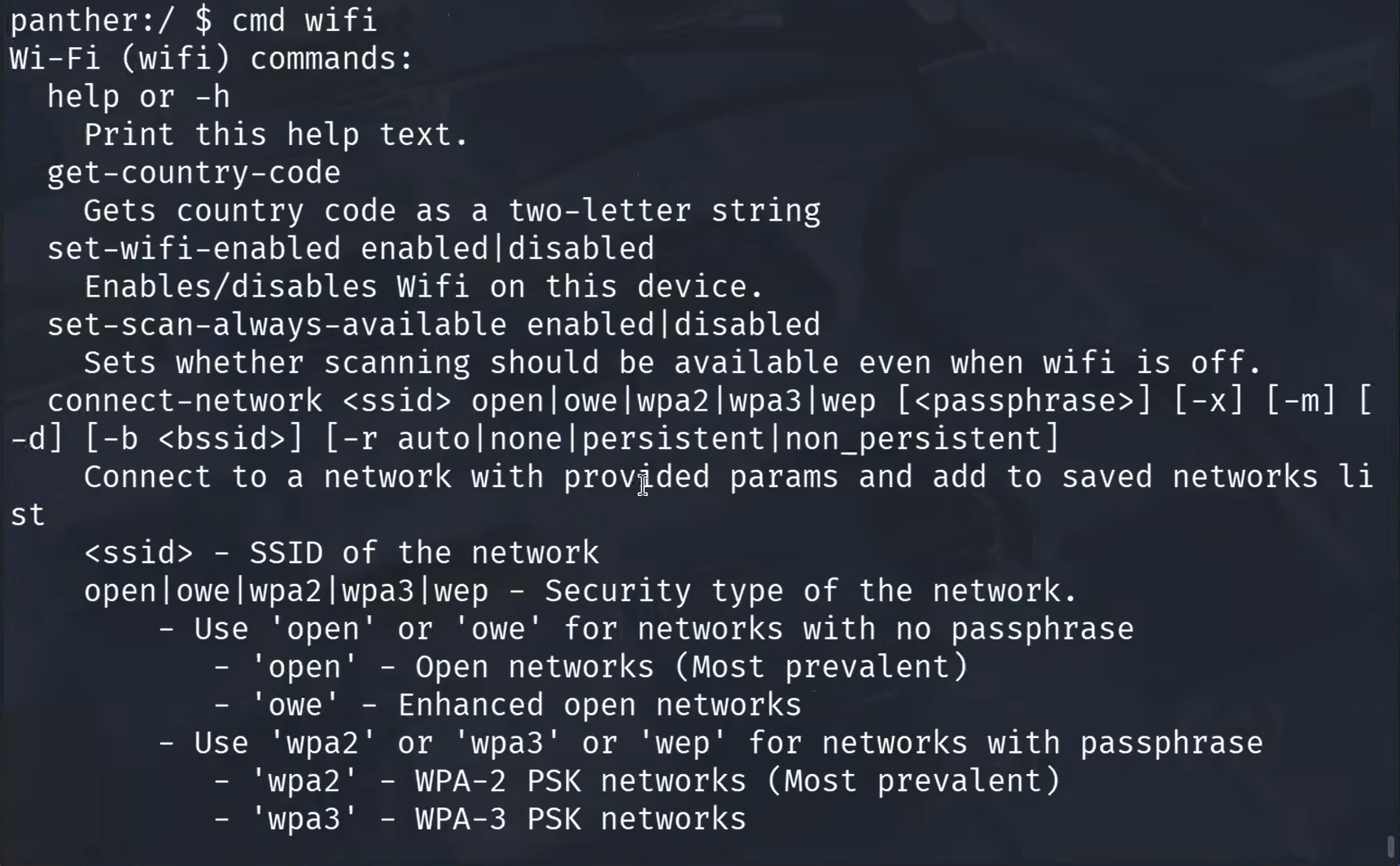 Accessing this service requires the cmd wifi command. While shelling directly into the device via adb shell is an option, commands are often more efficiently executed directly from the Linux terminal. To see the full range of available capabilities, the help menu is accessed as follows: