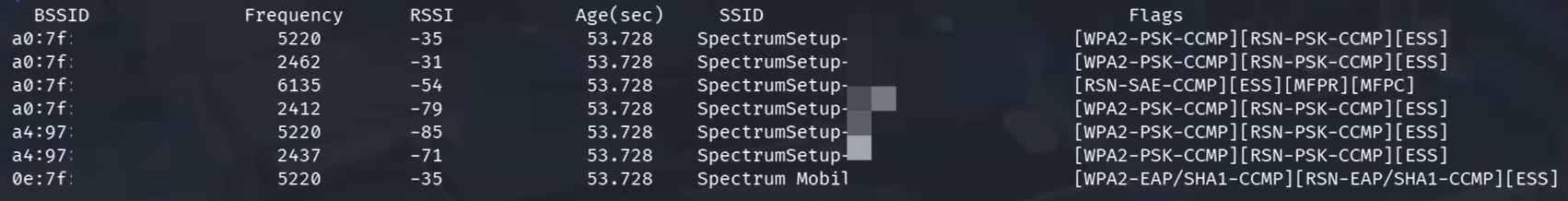 While no immediate output is provided, the success of the command can be verified by checking the exit code with echo $?. A return value of 0 indicates success. Once the scan is complete, the results-including BSSID, frequency, signal strength (RSSI), and SSID-are listed: