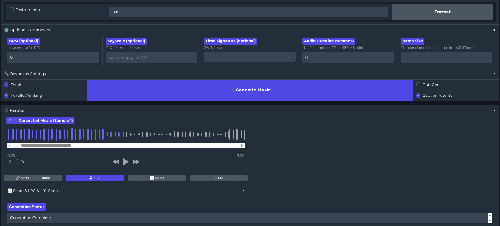 Once configured, the Generate Music button is clicked. On an RTX 3090 or similar hardware, a full song can be generated in under a minute - significantly faster than real-time playback.