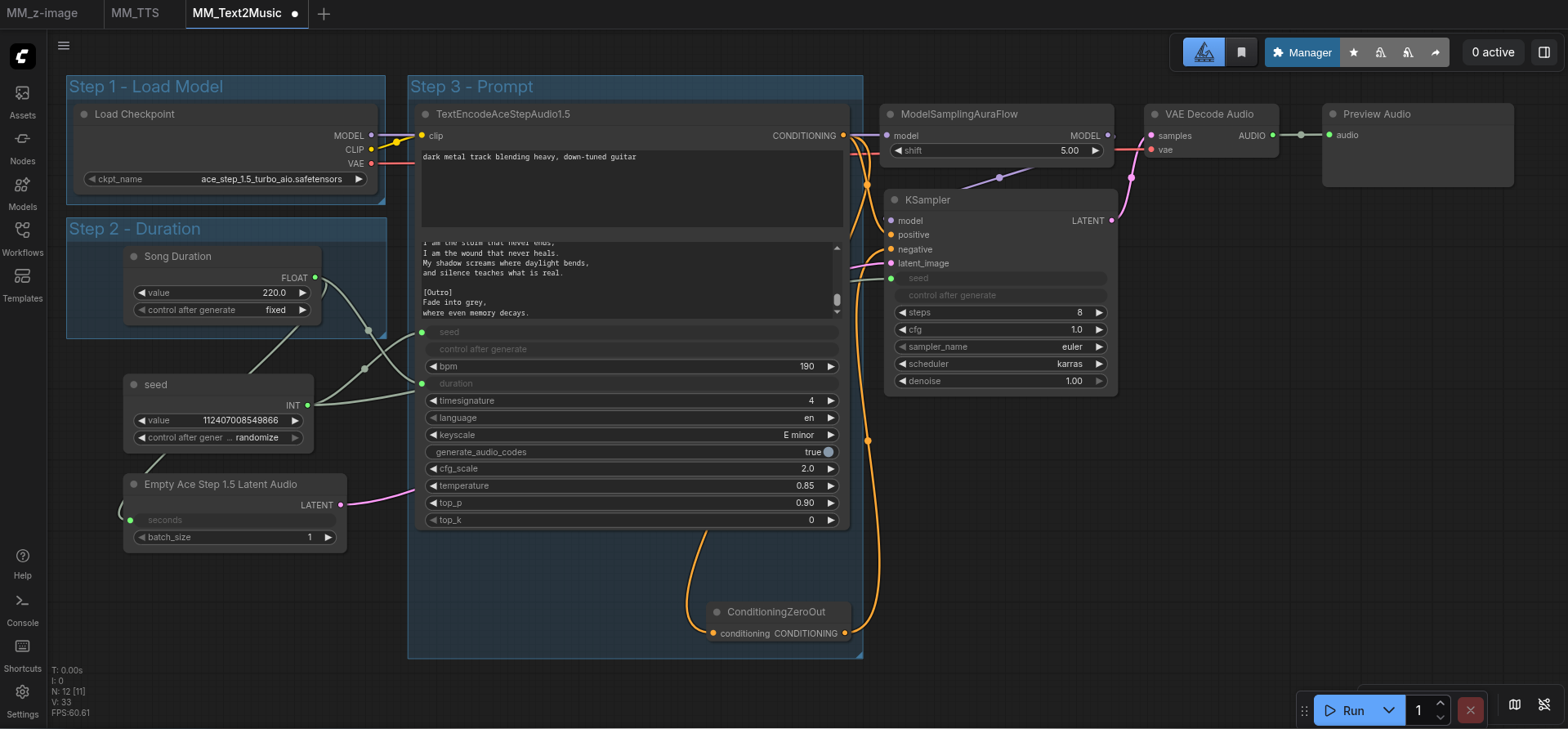 For this experiment, Ollama running the Qwen3 model was tasked with writing the lyrics. The goal was to create a "dark metal track blending heavy, down-tuned guitar."