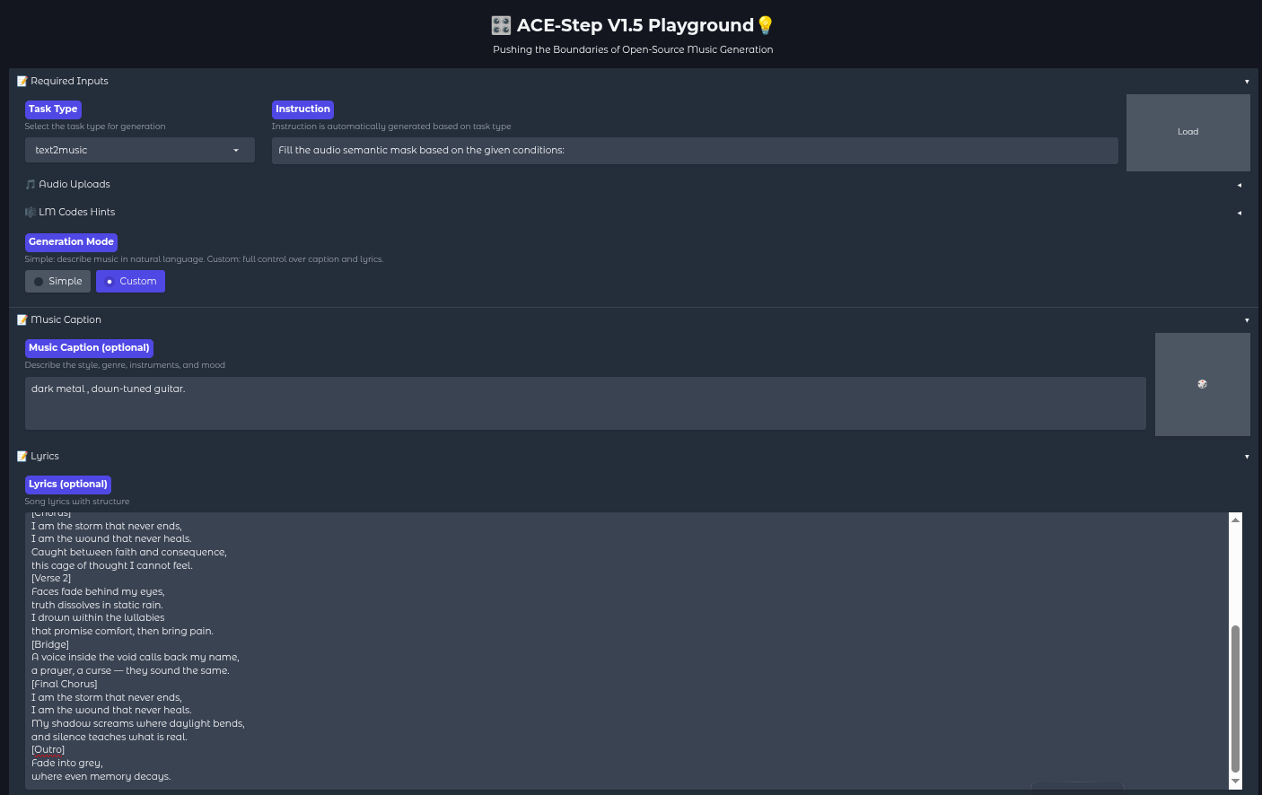 dark metal track blending heavy, down-tuned guitaris entered here. This guides the diffusion model on how the instruments should sound. - Lyrics: The full block of lyrics shown above is pasted into the lyrics field. The structural tags (like
