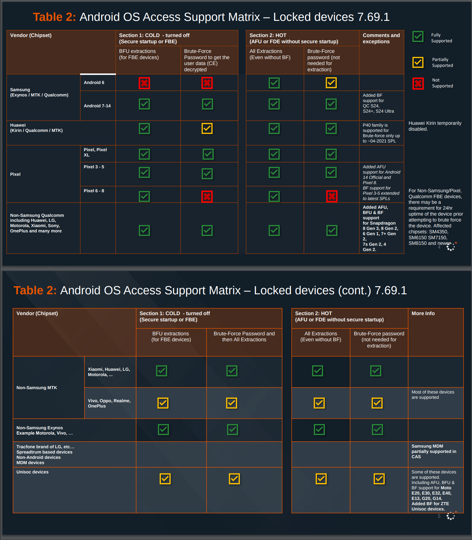 Cellebrites Liste der Fähigkeiten für Kunden vom April 2024 zeigt, dass das Unternehmen jeden Nicht-GrapheneOS-Android-Hersteller erfolgreich angreifen kann - sowohl BFU (Before First Unlock) als auch AFU (After First Unlock). GrapheneOS wird nicht kompromittiert, wenn der Patch-Level nach Ende 2022 liegt.