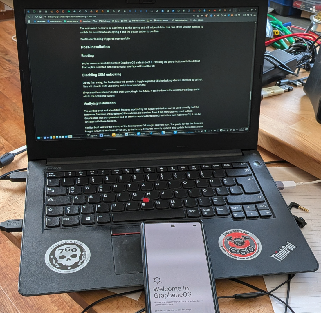 - GrapheneOS-Image flashen (der WebInstaller lädt alles automatisch)